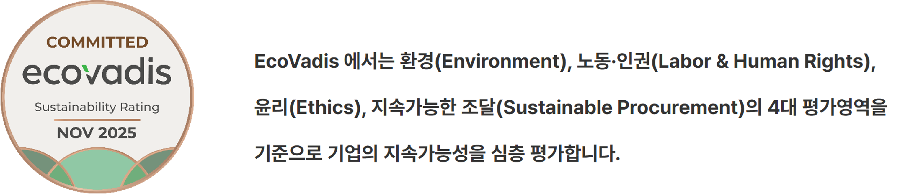 EcoVadis는 네 가지 평가 영역에 포함된 세부항목별로 기업이 제출한 모든 증빙자료를 면밀히 검토하여, 기업의 지속가능성 수준을 객관적으로 평가하는 신뢰도 높은 기관으로 잘 알려져 있습니다.